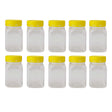 Square plastic empty food grade jars with yellow tamper evident lids, commonly used for packing food products and items such as beads, crafts, decorations, honey, grains, beans etc.