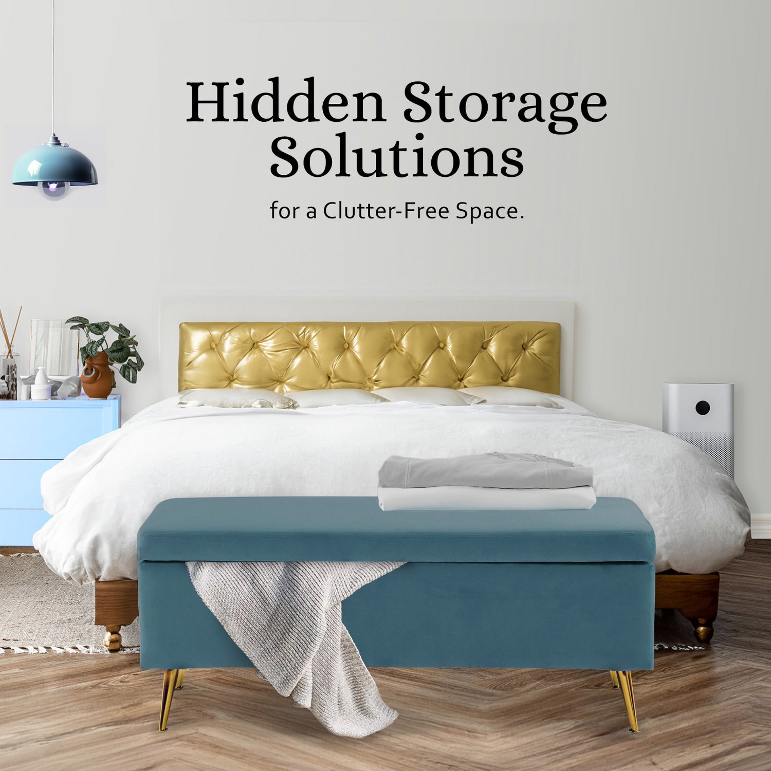 With sleek metal legs for stability, lift the lid to find a roomy interior - ideal for storing blankets and pillows discreetly. This Ottoman Storage is more than practical; it's versatile, serving as a comfy footrest or extra seating for guests.