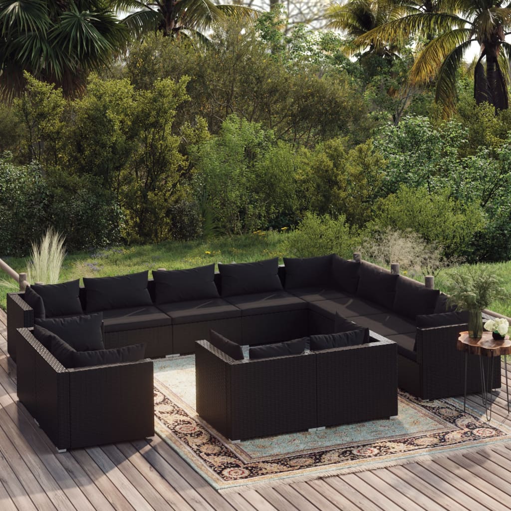 This trendy 12-piece poly rattan garden lounge set is meant to be a great addition to your outdoor living space. It adds a touch of modern elegance to your patio, balcony or garden with its understated and stylish design. Premium material: The patio lounge set is designed with water-resistant PE rattan, making it hard-wearing and suitable for daily outdoor use.Sturdy frame: The powder-coated steel frames ensure sturdiness and stability.Comfortable seating: The thickly padded and soft cushions provide optimal comfort for your outdoor sitting.Flexible layout for any occasion: This modern garden furniture can be separated and arranged into a variety of ways to fit your outdoor space, allowing you to have a nice chat with families or friends in your lovely patio, garden, backyard, poolside, etc. Note:In order to extend the life of your outdoor furniture, we recommend you to clean it regularly and do not leave it outdoors without protection unnecessarily.Clean: Use a mild soap solution.Storing: If possible, store in a cool, dry place indoors. If the product is stored outdoors, protect it with a waterproof cover. Wipe and dry the excess water or snow from flat surfaces after a rain or snowfall. Allow sufficient air circulation to avoid moisture-related damage.