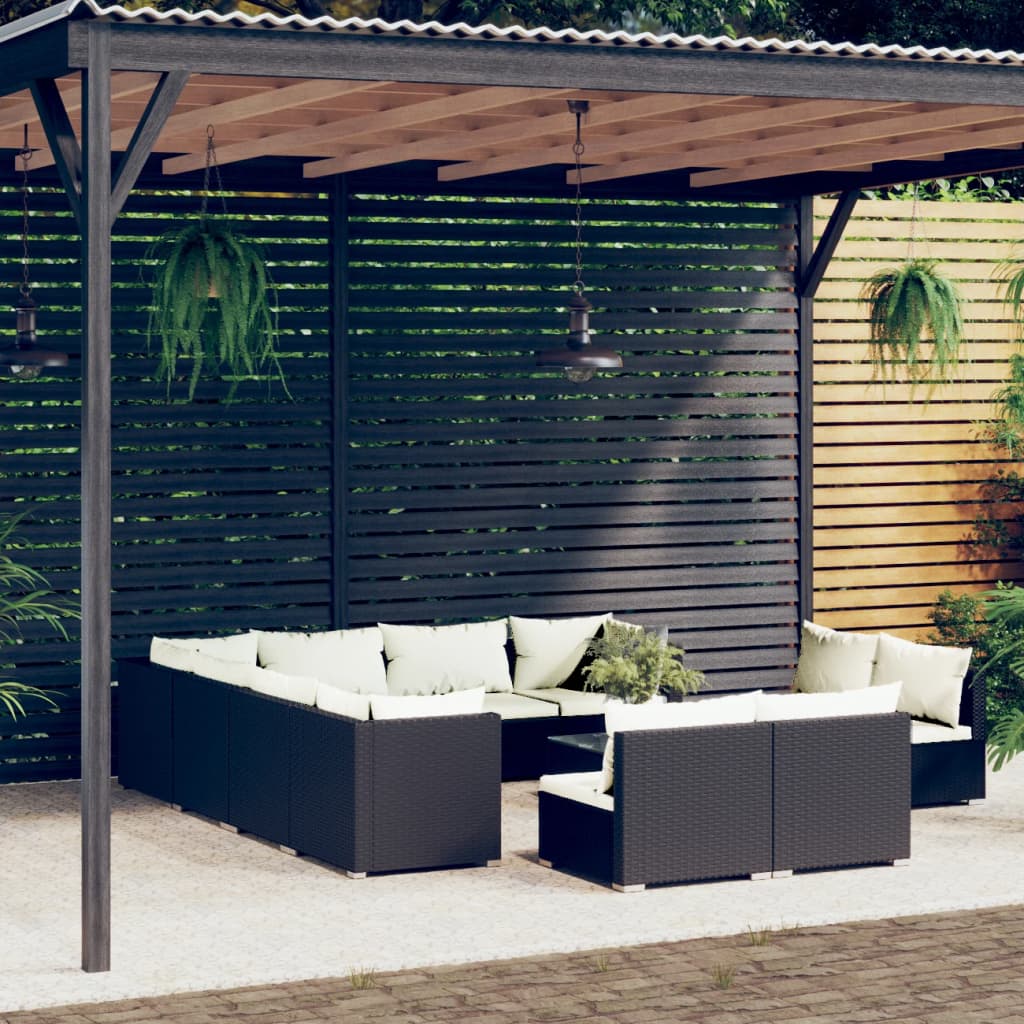This trendy 12-piece poly rattan garden lounge set is meant to be a great addition to your outdoor living space. It adds a touch of modern elegance to your patio, balcony or garden with its understated and stylish design. Premium material: The patio lounge set is designed with water-resistant PE rattan, making it hard-wearing and suitable for daily outdoor use.Sturdy frame: The powder-coated steel frames ensure sturdiness and stability.Comfortable seating: The thickly padded and soft cushions provide optimal comfort for your outdoor sitting.Flexible layout for any occasion: This modern garden furniture can be separated and arranged into a variety of ways to fit your outdoor space, allowing you to have a nice chat with families or friends in your lovely patio, garden, backyard, poolside, etc. Note:In order to extend the life of your outdoor furniture, we recommend you to clean it regularly and do not leave it outdoors without protection unnecessarily.Clean: Use a mild soap solution.Storing: If possible, store in a cool, dry place indoors. If the product is stored outdoors, protect it with a waterproof cover. Wipe and dry the excess water or snow from flat surfaces after a rain or snowfall. Allow sufficient air circulation to avoid moisture-related damage.