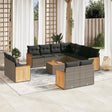 This garden sofa set is the perfect addition to your backyard, terrace, or patio, providing a comfortable and inviting space for chatting with family and friends or simply relaxing and enjoying the outdoors. Durable material: PE rattan, also known as poly rattan, is a strong, low-maintenance synthetic material that looks like natural rattan. It's lightweight, easy to clean, and commonly used for outdoor furniture due to its durability and weather-resistant properties.Comfortable seat experience: This outdoor furniture, complete with thickly padded cushions, offers a comfortable seating experience.Stable and easy-to-clean tabletop: This garden table has an acacia wood top that is sturdy, durable, and easy to clean with a damp cloth.Removable and washable cover: These seat cushions feature removable covers for easy washing and maintenance.Modular design: This outdoor furniture set has a modular design, making it completely flexible and easy to move around, so you can create a customised outdoor furniture arrangement. Good to know:To make sure your outdoor furniture stays beautiful, we recommend protecting it with a waterproof cover.