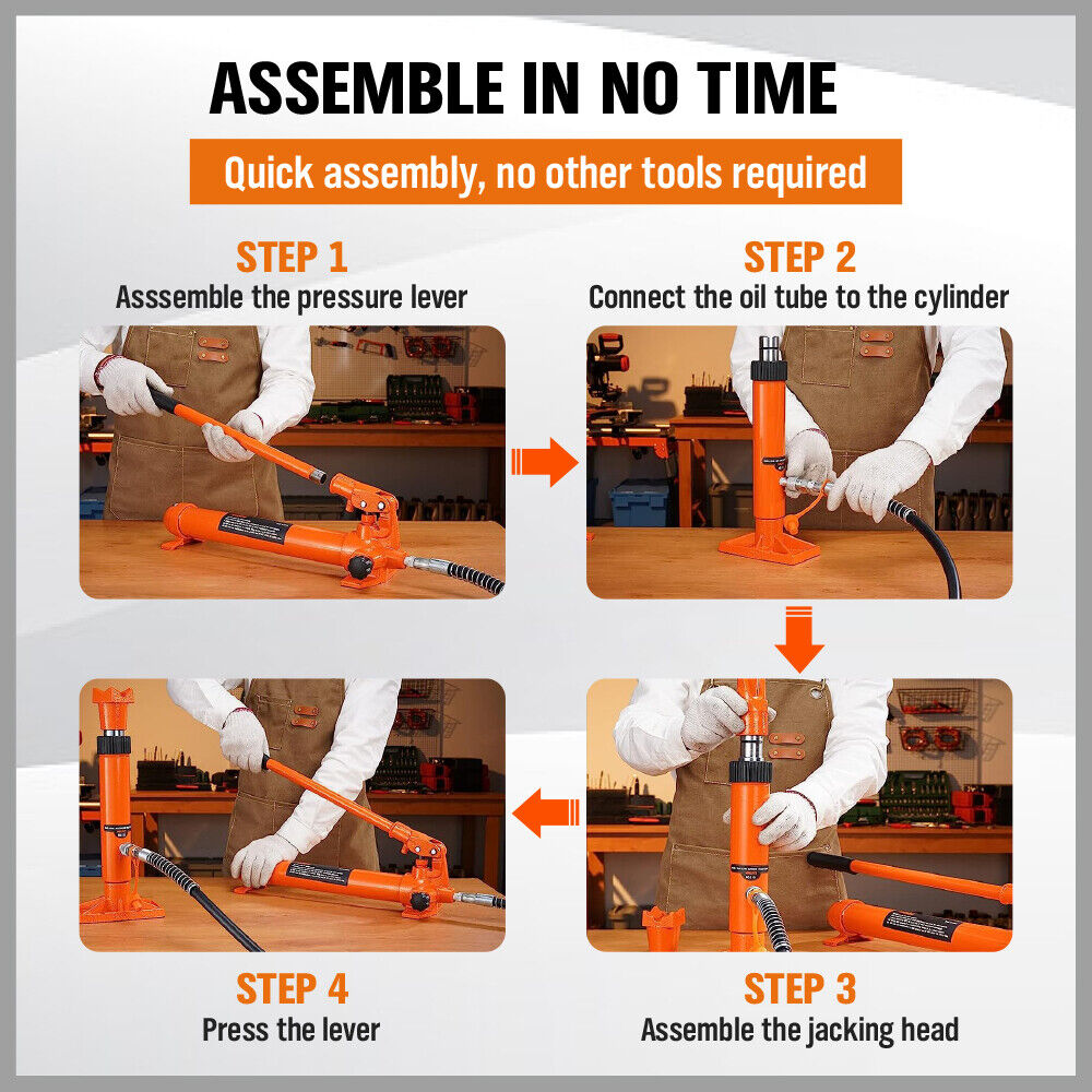 Perfect for All Your Needs: The portable hydraulic ram kit includes everything you need to complete your repair work! Hydraulic pump, hydraulic ram, 4pcs extension tubes, serrated saddle, rubber head, V-shaped head, wedge head, connector, flat base, hydraulic spreader, spreader ram toe, plunger toe. You will be ready to take on any project without breaking a sweat.