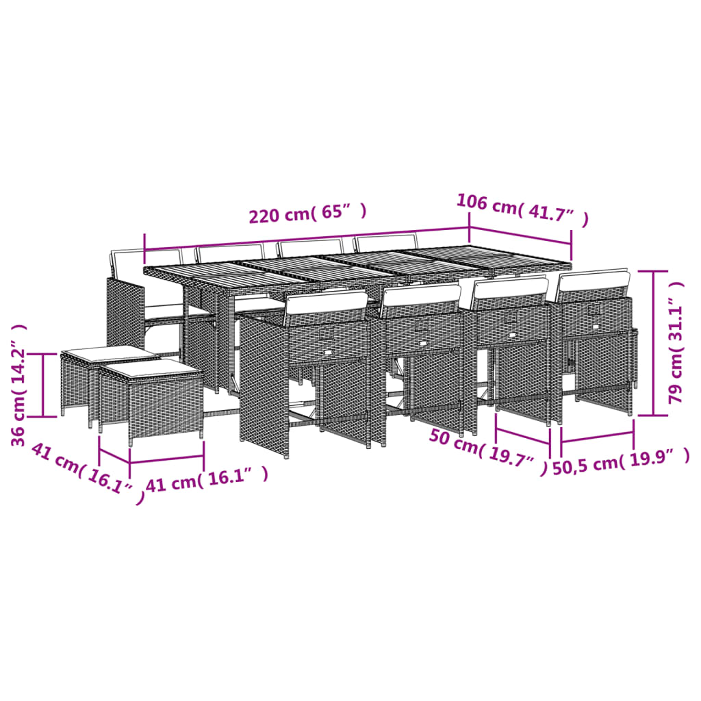 This garden dining set is a great choice for al fresco dining or just relaxing in the garden, backyard, or on the patio. Durable material: PE rattan, also known as poly rattan, is a strong, low-maintenance synthetic material that looks like natural rattan. It's lightweight, easy to clean, and commonly used for outdoor furniture due to its durability and weather-resistant properties.Compact storage: These chairs have a flap backrest that can be folded down, making it easy to store them under the table. When folded, they neatly fit under the table, forming a space-saving cube shape. Additionally, the stools can also be stored under the chairs, further maximizing space efficiency.Comfortable seat experience: This outdoor furniture, complete with thickly padded cushions, offers a comfortable seating experience.Removable and washable cover: These seat cushions feature removable covers for easy washing and maintenance. The chair cushion covers have a flap at the back for easy attachment to the chairs.Stable and easy-to-clean tabletop: This garden table has an acacia wood top that is sturdy, durable, and easy to clean with a damp cloth. Good to know: To make sure your outdoor furniture stays beautiful, we recommend protecting it with a waterproof cover.