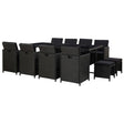 Our stylish rattan garden furniture set will become the focal point of your garden or patio! This rattan dining set, with an elegant design, will be a great choice for al fresco dining or relaxing in the garden. The powder-coated steel frames make the table, chairs and stools strong and sturdy, and thanks to their lightweight constructions, all items are easy to move. Thanks to the weather-resistant and waterproof PE rattan, the dining set is easy to clean. The glass top is also easy to clean with a damp cloth. The thick, soft, foam-filled seat and back cushions are highly comfortable and made of water-repellent polyester. The removable and washable covers are equipped with zips. Delivery includes 1 table, 8 chairs, 4 stools, and 20 cushions. Note: We recommend covering the set in the rain, snow and frost.