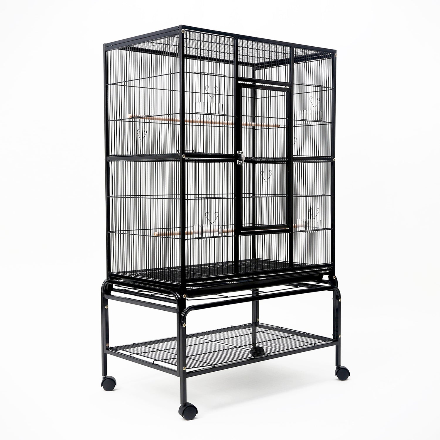 The cage's frame is made of durable and high-quality wrought iron and it is powder coated in order to prevent it from rusting and offer a longer service life. There is one lockable door so you can keep your bird safe and have easy access inside the cage. There is also a removable tray under in order to make cleaning easy. There are four, 360 degree swivel caster plastic wheels so relocating the birdcage is very easy. 4 plastic water/food container and 2 rest wooden perches are included. The cage also has a clever shelf under it so you can store your birds' needs, such as water, food and cleaning tools.