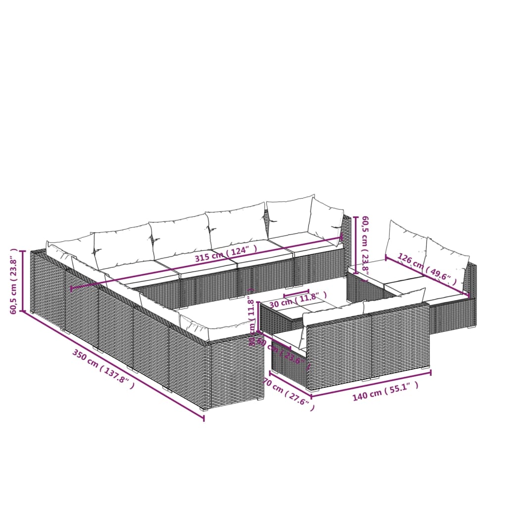 This trendy 14-piece poly rattan garden lounge set is meant to be a great addition to your outdoor living space. It adds a touch of modern elegance to your patio, balcony or garden with its understated and stylish design. Premium material: The patio lounge set is designed with water-resistant PE rattan, making it hard-wearing and suitable for daily outdoor use.Sturdy frame: The powder-coated steel frames ensure sturdiness and stability.Comfortable seating: The thickly padded and soft cushions provide optimal comfort for your outdoor sitting.Flexible layout for any occasion: This modern garden furniture can be separated and arranged into a variety of ways to fit your outdoor space, allowing you to have a nice chat with families or friends in your lovely patio, garden, backyard, poolside, etc. Note:In order to extend the life of your outdoor furniture, we recommend you to clean it regularly and do not leave it outdoors without protection unnecessarily.Clean: Use a mild soap solution.Storing: If possible, store in a cool, dry place indoors. If the product is stored outdoors, protect it with a waterproof cover. Wipe and dry the excess water or snow from flat surfaces after a rain or snowfall. Allow sufficient air circulation to avoid moisture-related damage.