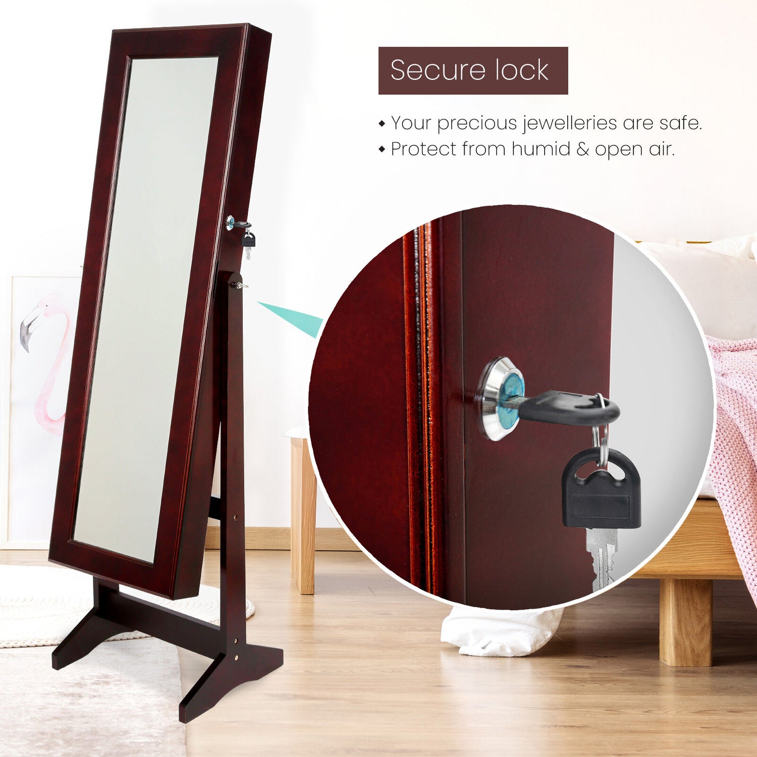This high-quality La Bella LUVO Walnut Multifunctional Mirror Jewellery Lockable Cabinet is ideal for you if you need a compact and stylish storage option for your precious accessories! The mirror is a full-length dressing mirror so you can enjoy the convenience of having a mirror instantly available to check out how great your jewelleries fit with your dressing! It will blend in well in any room and this is for sure a great solution if you want to keep your jewelleries and room tidy.