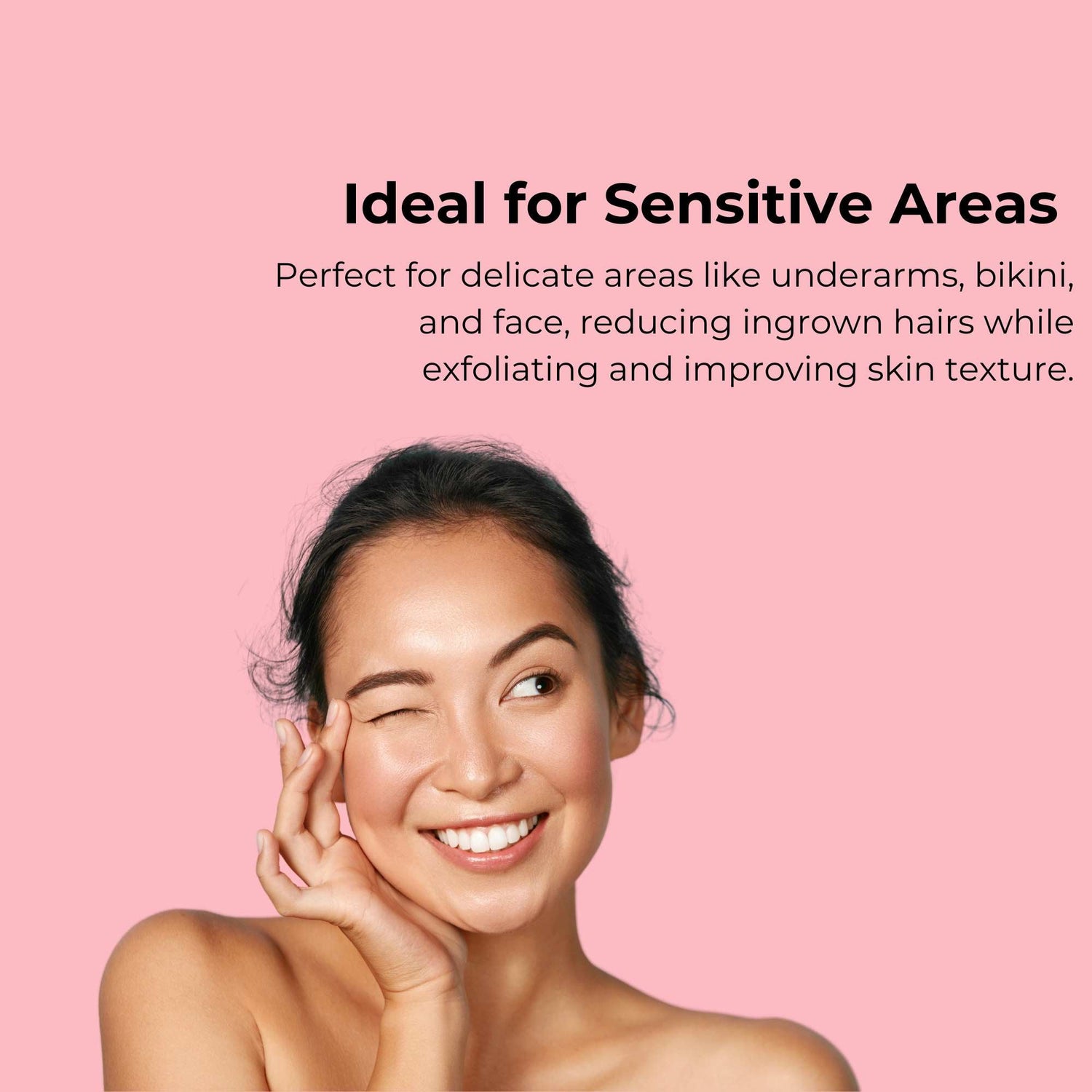 - Ideal for Sensitive Areas: Perfect for delicate areas like underarms, bikini, and face, reducing ingrown hairs while exfoliating and improving skin texture.