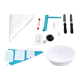 - Accessories: Straight and right-angle cream trowels, 3 cream scrapers, 2 flower nails, 1 flower lifter, 1 tip cleaning brush, 1 straight cake spatula, 1 curved cake spatula, 2 cake nozzle couplers, 100 disposable icing bags, and 1 12-inch reusable pastry bag