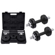 This versatile dumbbell set is perfect for targeting chest, biceps, arms, triceps and back muscles. It includes eight 1 kg weight plates, four 0.5 kg weight plates, as well as two steel dumbbell bars, which has a total weight of about 15 kg. This set allows the users to variably select the weights they want to lift for different exercises. The structure of the handles provides maximum grip so the dumbbell bar lies firmly in your hands. Additionally, this dumbbell has star-shaped screw collars in order to keep the weights in place. This set can be easily combined with our weight benches or other dumbbell sets.