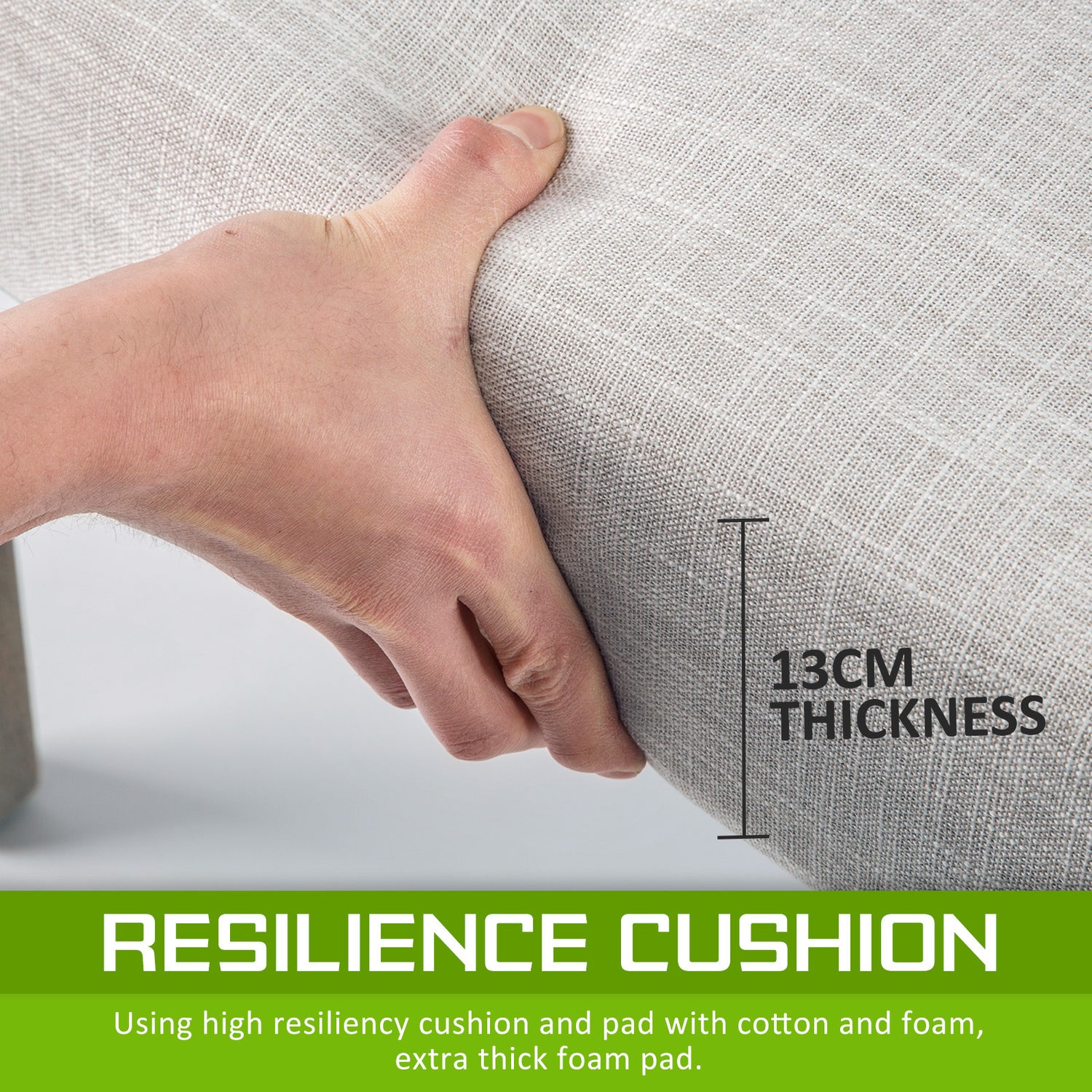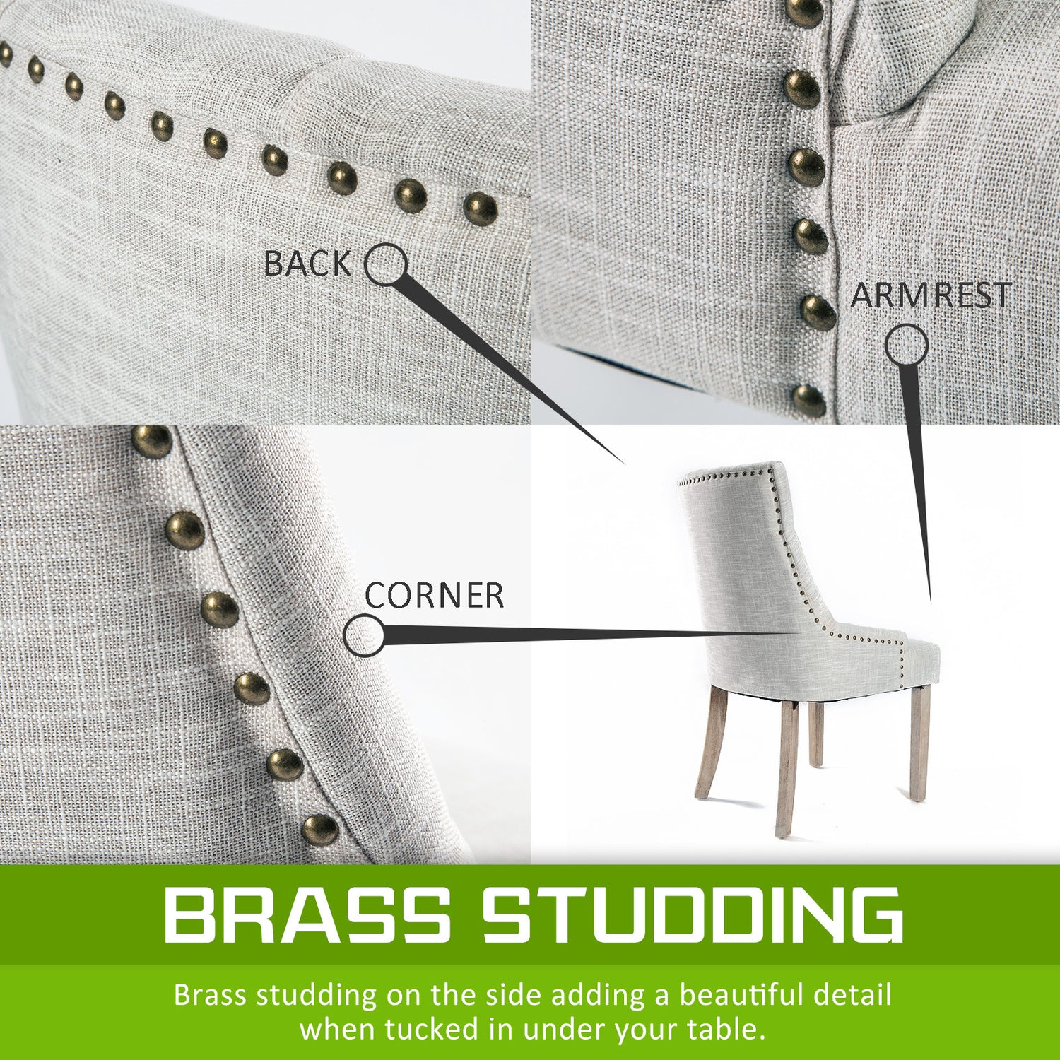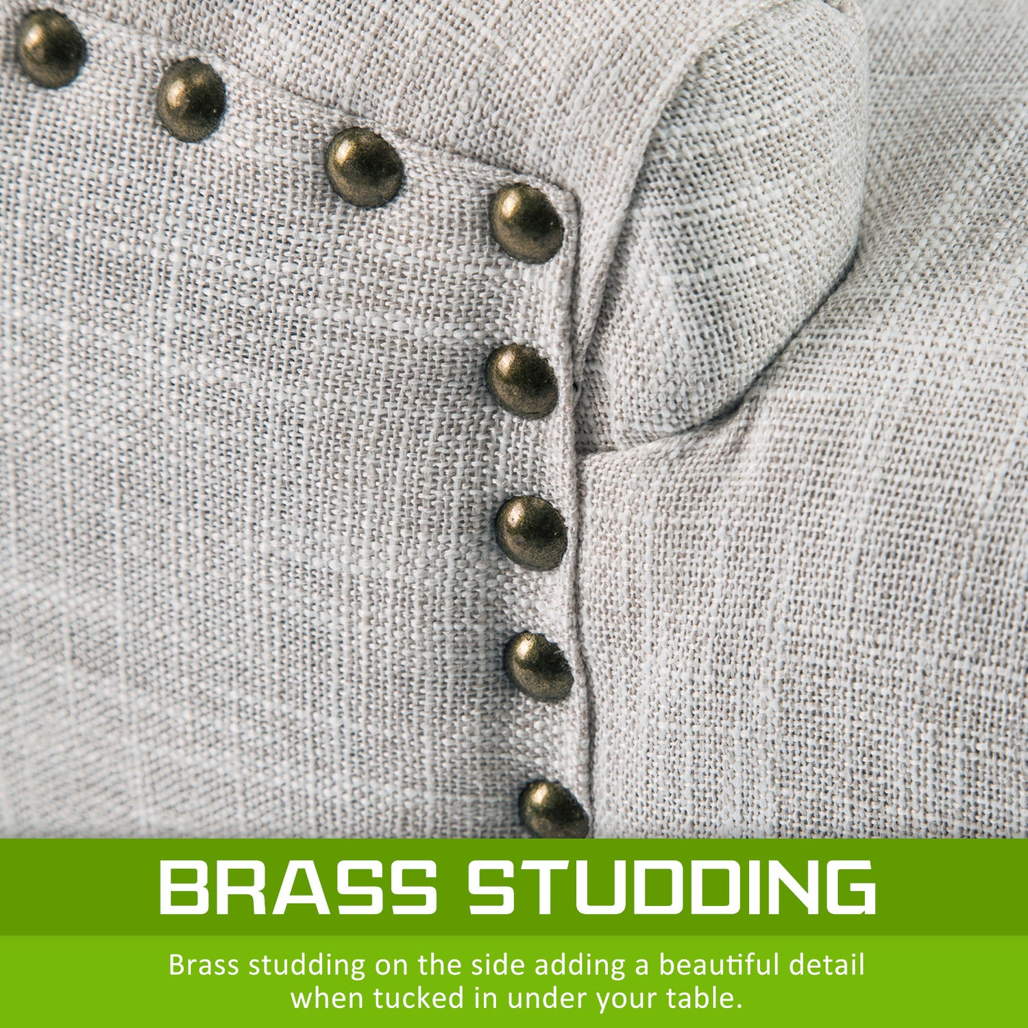 Padded with 13cm high resilience foam, this thick cushioned seat is wider than normal chairs. All these features will no doubt give top maximum comfort. Elegant upholstered, together with a deep tufting design and brass studding on edges, this French provincial style chair will definitely give you and your family and friends additional enjoyment, comfort and pleasure.