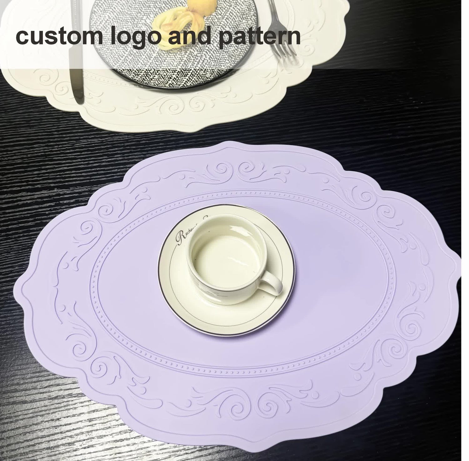Oval Embossed Floral Edged Silicone Placemats, Non-Slip, Heat-Resistant, Easy-to-Clean Dining Table Mats, Korean and European Style