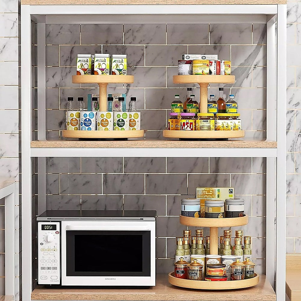 Introducing the versatile 2-Tier Bamboo Lazy Susan Turntable Organizer, ideal for enhancing storage in cabinets, pantries, countertops, kitchen islands, and tabletops. This organizer effortlessly holds spices, cans, and various pantry essentials.