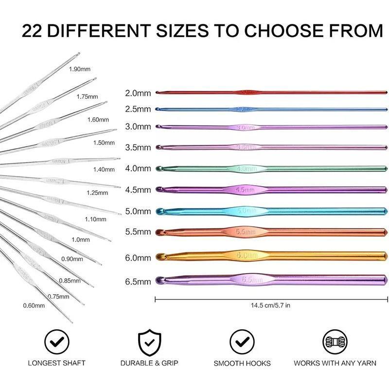 Complete 22-piece crochet hook kit: Includes 12 fine steel hooks and 10 aluminium hooks, covering sizes from 0.6 mm to 6.5 mm.