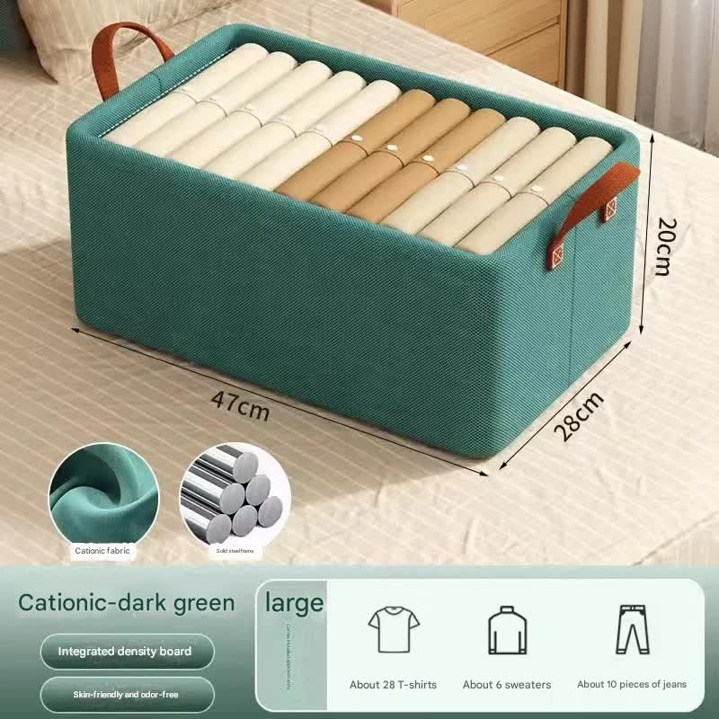 Declutter and organize your space with our versatile Foldable Fabric Storage Bin. This 26L organizer is perfect for storing clothes, trousers, sweaters, and more in your closet, wardrobe, or on shelves. It features a robust five-layer fabric construction, including a durable cationic fabric exterior, dual nano waterproof layers, and a thickened density board core for enhanced structure. The internal 4mm galvanized steel frame provides solid, stable support, ensuring the bin remains rigid and does not collapse, allowing for secure stacking to save space. When not in use, the frame folds down for compact storage. With convenient, widened handles, this skin-friendly and odorless bin makes organizing your personal items simple and stylish.
