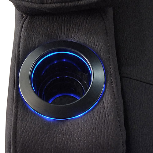 The armchair is equipped with a user-friendly electric reclining mechanism and LED features. Controls are conveniently located for adjusting the recliner position and toggling LED lighting to create the perfect atmosphere.