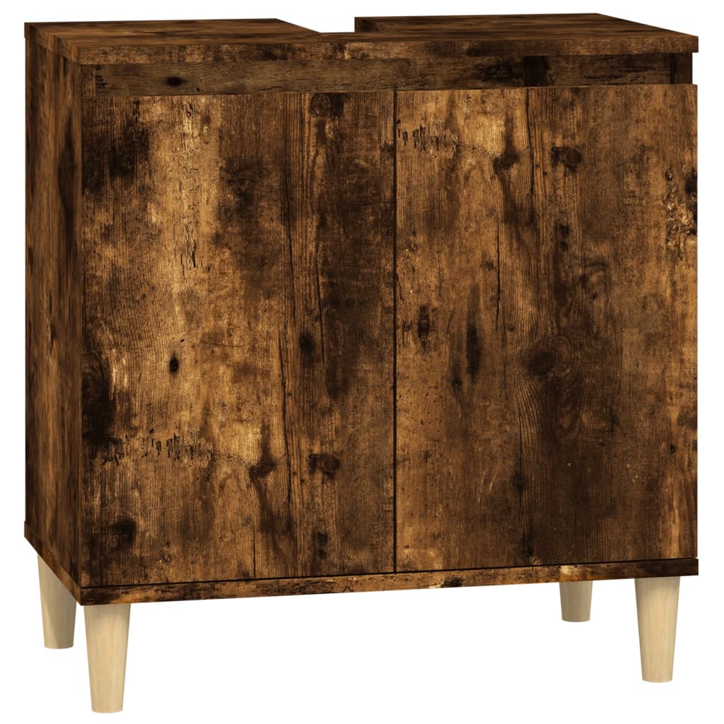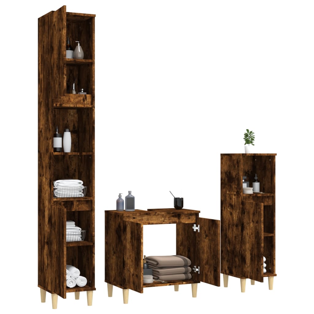 This stylish bathroom furniture set, featuring spacious storage space, is an excellent addition to your bathroom, giving it a tidy and striking appearance! Durable material: The engineered wood is of exceptional quality with a smooth surface and features strength, stability and resistance to moisture.Ample storage space: These bathroom cabinets offer ample storage space for keeping your bathroom supplies well organised.Wooden feet: The solid eucalyptus wood feet give the bathroom furniture a natural and pleasant look while ensuring stability.Easy-to-clean surface: The bathroom unit is easy to clean with a damp cloth.Stylish design: The clean lines and sleek design blend into your bathroom perfectly. Warning:To prevent it being overturned, this product must be used with the provided wall attachment device. Good to know:Screws and plugs for inside the wall are not included. We advise to find and use screws and plugs suitable specifically for your walls. If you're not sure, you can consult with a professional. Please read and follow each step of the instructions.