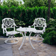 This bistro set, made of cast aluminium, provides a comfortable seating experience for you and your guests. The outdoor chairs and table, made of cast aluminium, are both sturdy and durable. The rust-resistant and weather-resistant material makes the furniture set ideal for outdoor use. These outdoor chairs feature stable round bases that allow for a smooth and comfortable swivelling motion so that you can sit at any angle. The beautiful patterns make the bistro set an elegant addition to your outdoor space. Additionally, the coffee table has an umbrella hole that can perfectly accommodate your umbrella to protect you from sun or rain. Note: In order to extend the life of your outdoor furniture, we recommend you to clean it regularly and do not leave it outdoors without protection unnecessarily.Clean: Use a mild soap solutionStoring: If possible, store in a cool, dry place indoors. If the product is stored outdoors, protect it with a waterproof cover. Wipe and dry the excess water or snow from flat surfaces after a rain or snowfall. Allow sufficient air circulation to avoid moisture-related damage.
