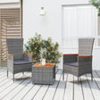 Seat cushion cover material Garden chair:Colour: GreyMaterial: PE rattan, steel, solid acacia wood with an oil finishOverall dimensions: 60 x 58 x 108 cm (W x D x H)Seat size: 47 x 45 cm (W x D)Seat height from the ground: 44 cmArmrest height from the ground: 66 cmTable:Colour: GreyMaterial: PE rattan, powder-coated steel, solid acacia wood with an oil finishDimensions: 45 x 45 x 40 cm (W x D x H)Cushion:Colour: Dark greySeat cushion cover material: Fabric (100% polyester)Seat cushion filling material: FoamSeat cushion thickness: 4 cmDelivery contains:2 x Garden chair1 x Table2 x Seat cushion