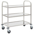 This 3-tier kitchen trolley will come in handy in the kitchen or at parties due to its robust construction. It can be used to easily serve food and drinks or to transport dishes to the kitchen. The large trays provide ample space for the optimal presentation of food and drinks. The stainless steel frame keeps the serving cart stable and sturdy even at full load. Thanks to the smoothly-rolling castors, the trolley can be moved around effortlessly and quietly. Additionally, two of the castors have brakes to prevent the cart from rolling away, meaning that you can also use it to store tools and other daily household products. The kitchen trolley is easy to assemble.