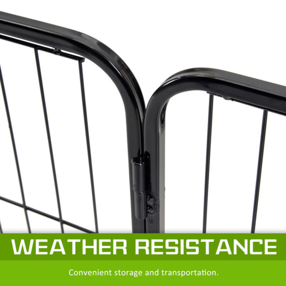 It is a multi-configuration playpen with 8 panels which allows you to turn your playpen into different shapes. The playpen is made of durable extra heavy duty steel frames construction with black powder coat finish. This fine finish provides long lasting protection and weather resistance. The access door has bolt latches and this ensures that your pet doesn't have the opportunity to run away and the round edges ensure pet safety.