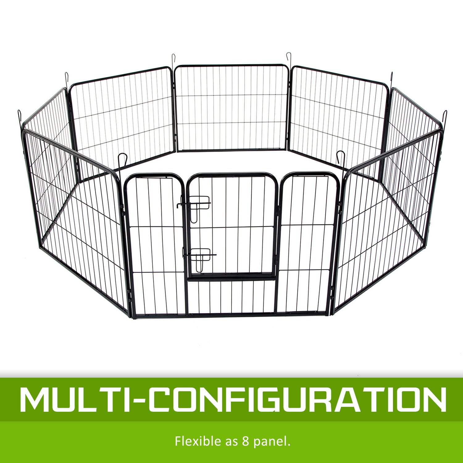 It is a multi-configuration playpen with 8 panels which allows you to turn your playpen into different shapes. The playpen is made of durable extra heavy duty steel frames construction with black powder coat finish. This fine finish provides long lasting protection and weather resistance. The access door has bolt latches and this ensures that your pet doesn't have the opportunity to run away and the round edges ensure pet safety.