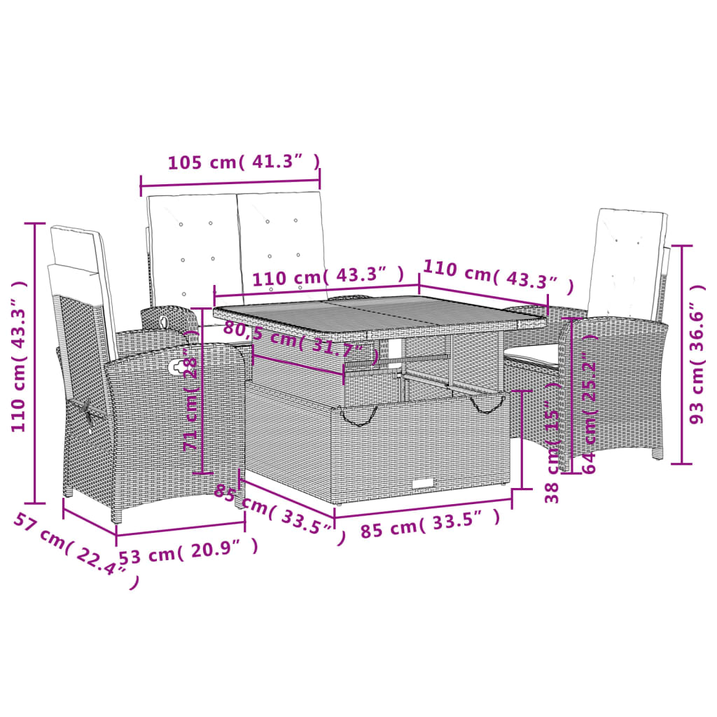 This garden dining set is a great choice for al fresco dining or just relaxing in the garden, backyard, or on the patio. Durable material: PE rattan, also known as poly rattan, is a strong, low-maintenance synthetic material that looks like natural rattan. It's lightweight, easy to clean, and commonly used for outdoor furniture due to its durability and weather-resistant properties.Adjustable backrest: This garden seat has a handle. You can adjust the backrest to any position by pulling the handle, and quickly return it to its original position.Adjustable tabletop: The tabletop can be lifted to make the table higher, which transforms the outdoor table from a coffee table to a dining table. It's perfect for having guests over or eating meals outside.Removable and washable cover: These seat cushions feature removable covers for easy washing and maintenance. The back cushions have a flap at the back for easy attachment to the backrests.Comfortable seat experience: This outdoor furniture, complete with thickly padded cushions, offers a comfortable seating experience. Good to know:To make sure your outdoor furniture stays beautiful, we recommend protecting it with a waterproof cover.