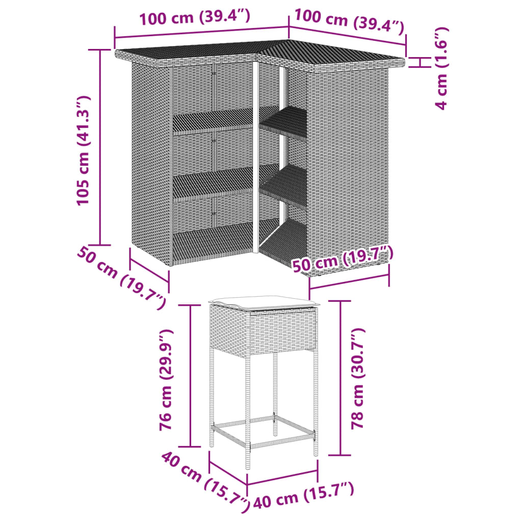 This trendy garden bar set, combining both style and function, is surely meant to be the centrepiece of your garden, patio, and any other living space. Durable material: PE rattan, also known as poly rattan, is a strong, low-maintenance synthetic material that looks like natural rattan. It's lightweight, easy to clean, and commonly used for outdoor furniture due to its durability and weather-resistant properties.Comfortable seat experience: This outdoor furniture, complete with thickly padded cushions, offers a comfortable seating experience.Removable and washable cover: These seat cushions feature removable covers for easy washing and maintenance.Robust and stable frame: The powder-coated steel frame ensures that the garden furniture is strong and stable for daily outdoor use. Good to know:To make sure your outdoor furniture stays beautiful, we recommend protecting it with a waterproof cover.