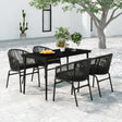 Create a compelling and cohesive aesthetic in your outdoor space with this garden dining set! This garden dinner set is made of powder-coated steel frame, which makes it sturdy and stable for daily outdoor use. The smooth glass tabletop is easy to clean with a damp cloth and perfect for placing meals, drinks and other decorative items. The patio chairs are made of PVC rattan, making them durable and resistant to poor weather and UV rays. Besides, each seat comes with a removable thickly padded cushion for added comfort in your lounging time. Note: In order to extend the life of your outdoor furniture, we recommend you to clean it regularly and do not leave it outdoors without protection unnecessarily.Clean: Use a mild soap solution.Storing: If possible, store in a cool, dry place indoors. If the product is stored outdoors, protect it with a waterproof cover. Wipe and dry the excess water or snow from flat surfaces after a rain or snowfall. Allow sufficient air circulation to avoid moisture-related damage.