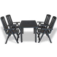 This weather-resistant outdoor dining set will be a great choice for al fresco dining in the garden, on the patio or at the campsite. The garden table has an umbrella hole so that you can use it with an umbrella and keep cool in the shade. The chairs' backrests have 4 reclining settings, so you can always find the most comfortable position. The chairs can be folded to save space when not in use. The set is made of durable plastic, making the table and chairs weather resistant and easy to clean. This outdoor dining set is also lightweight, which makes it easy to move around. Delivery includes 1 table and 4 folding chairs.