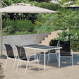 Enjoy everyday dinner with your family on this outdoor dining set! This dining set features a powder-coated steel frame, making it stable and durable. The comfortable outdoor chairs are upholstered in strong and easy-to-clean Textilene fabric. The armchairs can also be stacked to save space when not in use. The tabletop is very easy to clean with just a damp cloth. Note: In order to extend the life of your outdoor furniture, we recommend you to clean it regularly and do not leave it outdoors without protection unnecessarily.Clean: Use a mild soap solutionStoring: If possible, store in a cool, dry place indoors. If the product is stored outdoors, protect it with a waterproof cover. Wipe and dry the excess water or snow from flat surfaces after a rain or snowfall. Allow sufficient air circulation to avoid moisture-related damage.