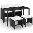 Our stylish rattan garden furniture set will become the focal point of your garden or patio! This rattan dining set, with an elegant design, will be a great choice for al fresco dining or relaxing in the garden. The powder-coated steel frames make the table, chairs and stools strong and sturdy, and thanks to their lightweight constructions, all items are easy to move. Thanks to the weather-resistant and waterproof PE rattan, the dining set is easy to clean. The glass top is also easy to clean with a damp cloth. The thick, soft, foam-filled seat and back cushions are highly comfortable and made of water-repellent polyester. The removable and washable covers are equipped with zips. Delivery includes 1 table, 2 chairs, 2 stools, and 6 cushions. Note: We recommend covering the set in the rain, snow and frost.