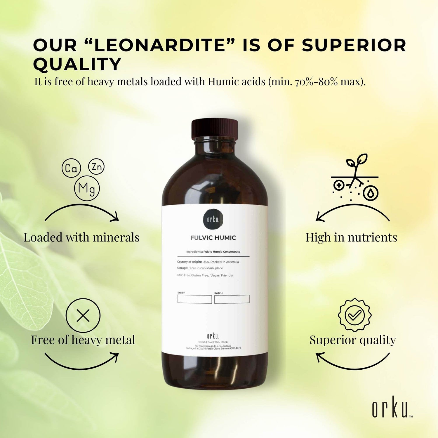 Humic substances are broken down into humic acid, and fulvic acids. The Fulvic fraction/component in our Organic Leonardite is approx 30%, perhaps the highest available in the world. Research into humic and fulvic acids have found them to be very beneficial, if not vital for human health, animal health and the health of the soils that grow the pastures for animals and or horticultural/agricultural crops hence the food we eat.