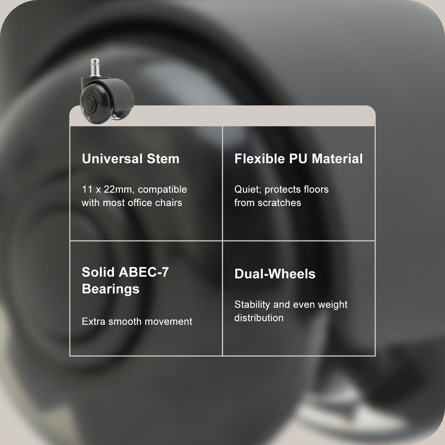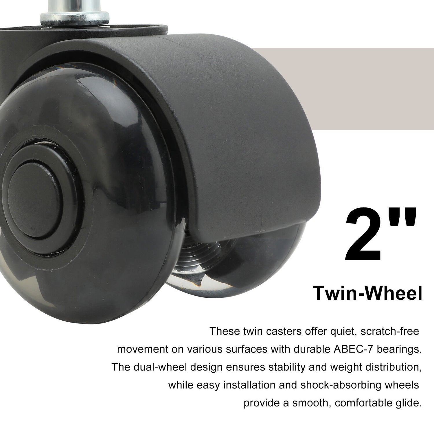 Is your office chair hard to move? Twin-wheel casters offer smooth, stable and quiet rolling across various surfaces such as wood, carpet, tile and marble, they enhance the comfort and efficiency of your workspace.
