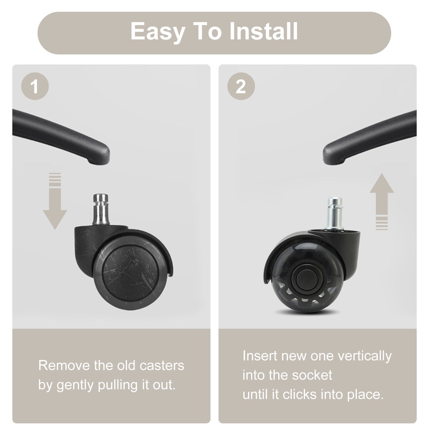 Installing these casters is quick and simple. Just insert them into the existing leg socket of your office chair or compatible furniture. The design makes them versatile, fitting most office and gaming chairs.
