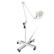 This is a Fluorescent lit, 5x magnifying floor lamp with rotational lamp head and swivel wheeled base.