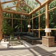This rattan sofa set combines style and functionality, and will become the focal point of your garden or patio. The whole furniture set is designed to be used outdoors year-round. Thanks to the weather-resistant and waterproof PE rattan, the lounge set is easy to clean, hard-wearing and suitable for daily use. The seat set features a sturdy powder-coated steel frame, which is highly durable. It is also lightweight and modular, which makes it completely flexible and easy to move around to suit any setting. The thick, removable cushions are highly comfortable. Delivery includes 1 corner sofa, 2 middle sofas, 1 coffee table, 2 footrests, 5 seat cushions and 4 back cushions. Note: We recommend covering the set in the rain, snow and frost.