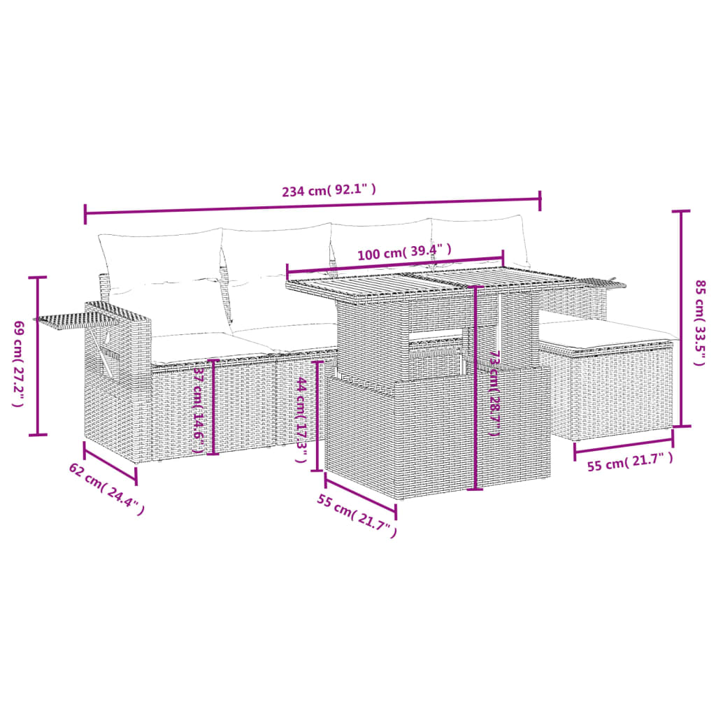 This garden sofa set is the perfect addition to your backyard, terrace, or patio, providing a comfortable and inviting space for chatting with family and friends or simply relaxing and enjoying the outdoors. Durable material: PE rattan, also known as poly rattan, is a strong, low-maintenance synthetic material that looks like natural rattan. It's lightweight, easy to clean, and commonly used for outdoor furniture due to its durability and weather-resistant properties.Adjustable tabletop: The tabletop can be lifted up to make the table higher, which transforms the outdoor table from a coffee table to a dining table. It's perfect for having guests over or eating meals outside.Convenient side table: This outdoor furniture features a foldable side table with a gas spring on the armrests, providing a convenient spot to keep your essentials within easy reach.Removable and washable cover: These seat cushions feature removable covers for easy washing and maintenance.Modular design: This outdoor furniture set has a modular design, making it completely flexible and easy to move around, so you can create a customised outdoor furniture arrangement. Good to know:To make sure your outdoor furniture stays beautiful, we recommend protecting it with a waterproof cover.