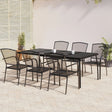 This trendy garden dining set, featuring an elegant and contemporary design, is a perfect choice for relaxing in your garden. Sturdy material: Steel is an exceptionally hard and strong material. It offers sturdiness and stability. The powder coating and e-coating on steel create a protective layer against wear and corrosion.Stable frame: The powder-coated and e-coated steel frame ensures the dining set's sturdiness and stability.Stackable function: The dining chairs are stackable to save space when not in use.Practical table: The sturdy tabletop of the dining table is perfect for placing meals, drinks, and other decorative items.Elegant legs: The curved legs of the garden dining table create an air of elegance while ensuring stability.Mesh design: The outdoor dining set with a mesh design looks simple and timeless and is suitable for balconies, porches, gardens, patios, etc. Note:To make sure your outdoor furniture stays beautiful, we recommend protecting it with a waterproof cover.