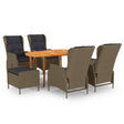 Create a compelling and cohesive aesthetic in your outdoor space with this garden dining set! This outdoor table is made of solid acacia wood, making it sturdy and stable. The oil-finished surface also makes the table easy to clean with a damp cloth. Additionally, the curved legs contribute to its stylish design. Featuring a steel frame covered with weather-resistant PE rattan, these dining chairs are sturdy and easy to clean. The thickly padded cushions add comfort in your lounging time. Note: In order to extend the life of your outdoor furniture, we recommend you to clean it regularly and do not leave it outdoors without protection unnecessarily.Clean: Use a mild soap solutionStoring: If possible, store in a cool, dry place indoors. If the product is stored outdoors, protect it with a waterproof cover. Wipe and dry the excess water or snow from flat surfaces after a rain or snowfall. Allow sufficient air circulation to avoid moisture-related damage.