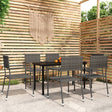 Enjoy a nice meal or afternoon tea in your outdoor space with this garden dining set! Featuring an elegant design, it will become the focal point of your garden and patio! The practical outdoor dining set has a steel frame, making it strong and sturdy. The garden chairs are made of water-resistant and maintenance-free PE rattan, making them perfect for outdoor use. Meanwhile, these outdoor chairs are lightweight and can be stacked to save space when not in use. In addition, the smooth glass tabletop is easy to clean with a damp cloth and excellent for placing meals, drinks and other decorative items. Note: In order to extend the life of your outdoor furniture, we recommend you to clean it regularly and do not leave it outdoors without protection unnecessarily.Clean: Use a mild soap solution.Storing: If possible, store in a cool, dry place indoors. If the product is stored outdoors, protect it with a waterproof cover. Wipe and dry the excess water or snow from flat surfaces after a rain or snowfall. Allow sufficient air circulation to avoid moisture-related damage.