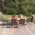 Create a compelling and cohesive aesthetic in your outdoor space with this garden dining set! The outdoor table is made of solid acacia wood, making it sturdy and stable. The oil-finished surface also makes the table easy to clean with a damp cloth. Featuring a steel frame covered with weather-resistant PE rattan, the dining chairs are sturdy and easy to clean. The garden chairs can be stacked to save space when not in use. Note: In order to extend the life of your outdoor furniture, we recommend you to clean it regularly and do not leave it outdoors without protection unnecessarily.Clean: Use a mild soap solution.Storing: If possible, store in a cool, dry place indoors. If the product is stored outdoors, protect it with a waterproof cover. Wipe and dry the excess water or snow from flat surfaces after a rain or snowfall. Allow sufficient air circulation to avoid moisture-related damage.