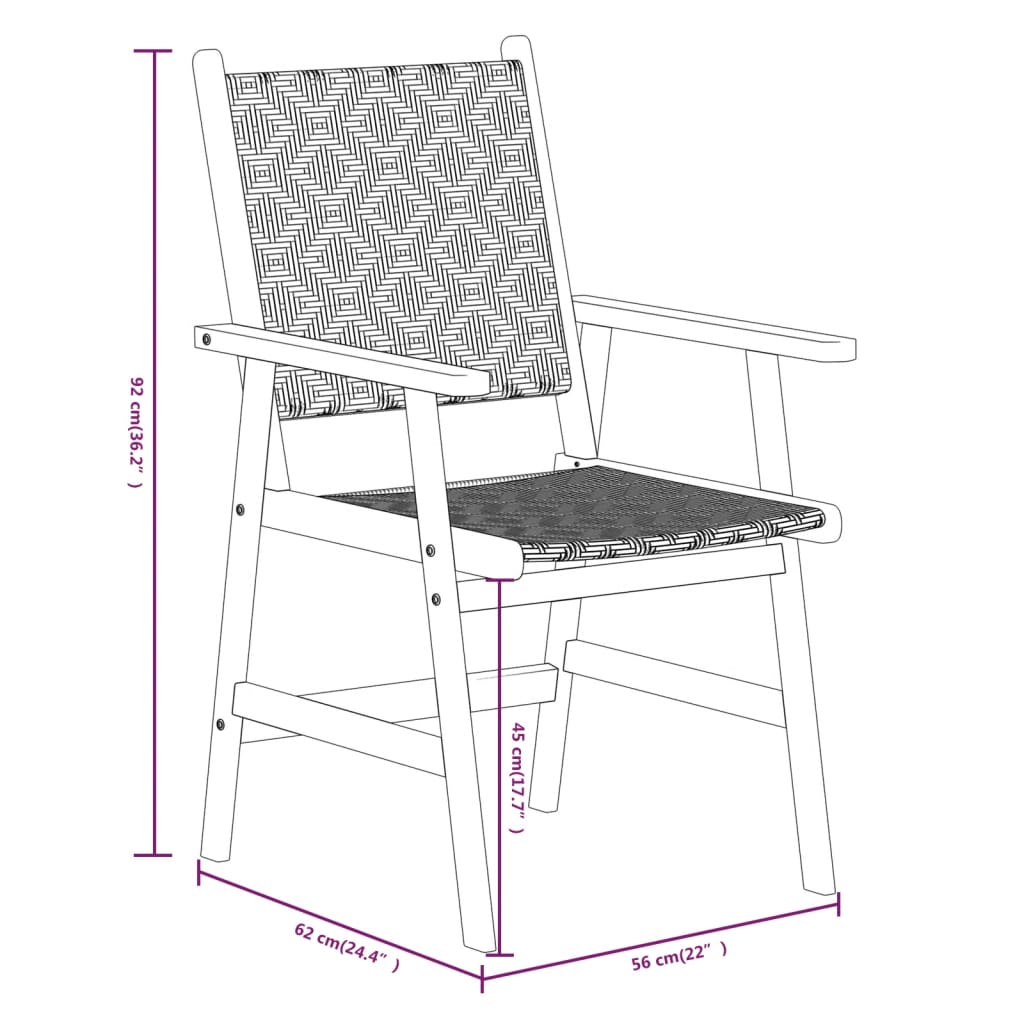 This garden dining set provides a perfect place for you to relax and enjoy the sunshine in your garden or patio. Made of solid acacia wood, the dining set is durable and stable. With the poly rattan backrest and seating area, these outdoor chairs provide seating comfort and are also easy to clean. Thanks to the attractive lattice pattern, the patio chairs are an eye-catcher in any living space. Note: In order to extend the life of your outdoor furniture, we recommend you to clean it regularly and do not leave it outdoors without protection unnecessarily.Clean: Use a mild soap solution.Storing: If possible, store in a cool, dry place indoors. If the product is stored outdoors, protect it with a waterproof cover. Wipe and dry the excess water or snow from flat surfaces after a rain or snowfall. Allow sufficient air circulation to avoid moisture-related damage.
