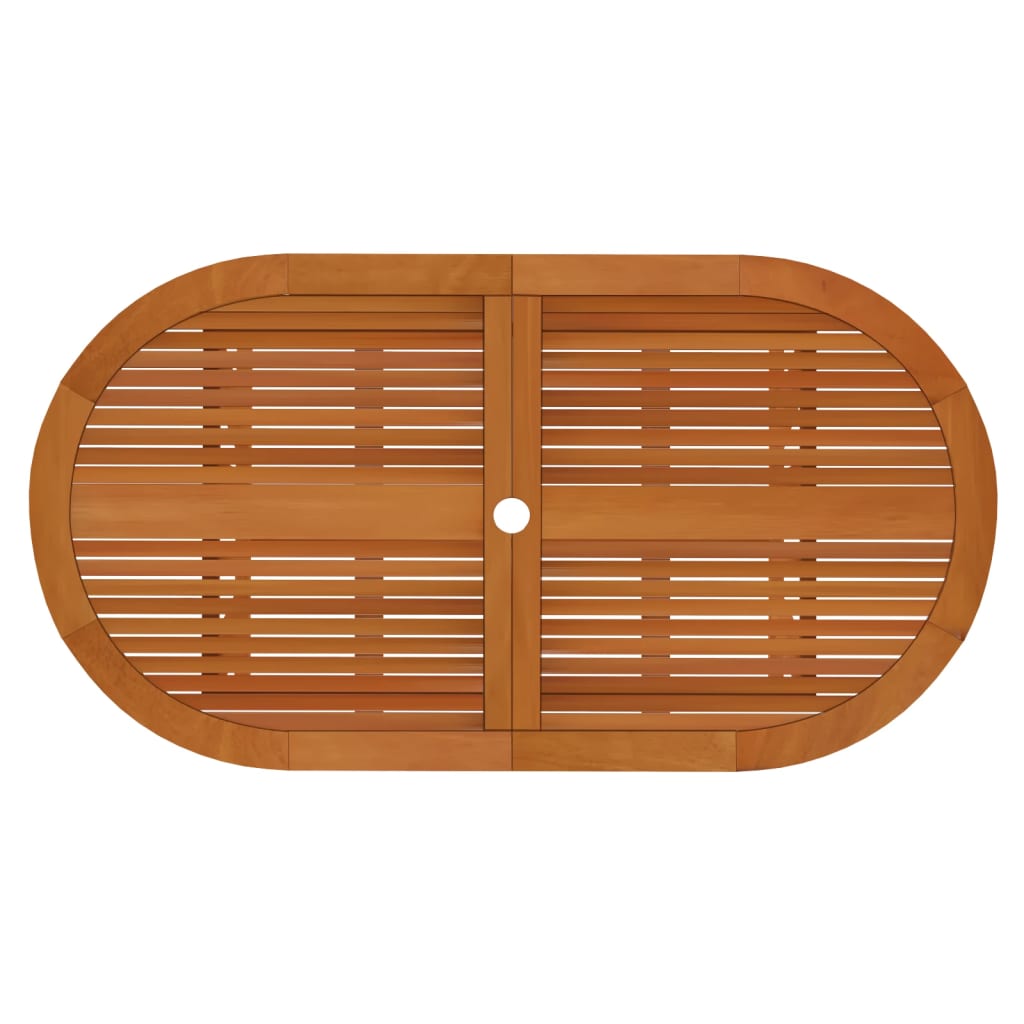 This wooden garden dining set has a rustic, timeless design and will be a great choice for dining in the garden or on the patio. Solid eucalyptus wood: Solid eucalyptus wood is a beautiful natural material. Eucalyptus wood is extremely dense and water repellent. The material is well-known for its rich reddish-brown colour.Practical umbrella hole: This outdoor table features an umbrella hole to provide an appropriate spot for your umbrella to help you avoid sunlight and rain.Reclining wooden chairs: The garden armchairs feature curved seats and backrests. Additionally, the backrest can be adjusted in 5 positions, so you can always find a comfortable position.Foldable design: These dining chairs can be folded to save space when not in use. You can easily carry them with you anywhere on your outdoor trips. Note:In order to extend the life of your outdoor furniture, we recommend you to clean it regularly and do not leave it outdoors without protection unnecessarily. Clean: Use a mild soap solution. Storing: If possible, store in a cool, dry place indoors. If the product is stored outdoors, protect it with a waterproof cover. Wipe and dry the excess water or snow from flat surfaces after a rain or snowfall. Allow sufficient air circulation to avoid moisture-related damage.