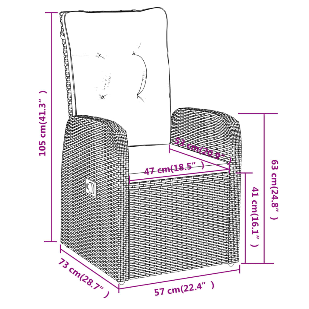 - Chair dimensions (not reclined): 57 x 73 x 105 cm (W x D x H)
