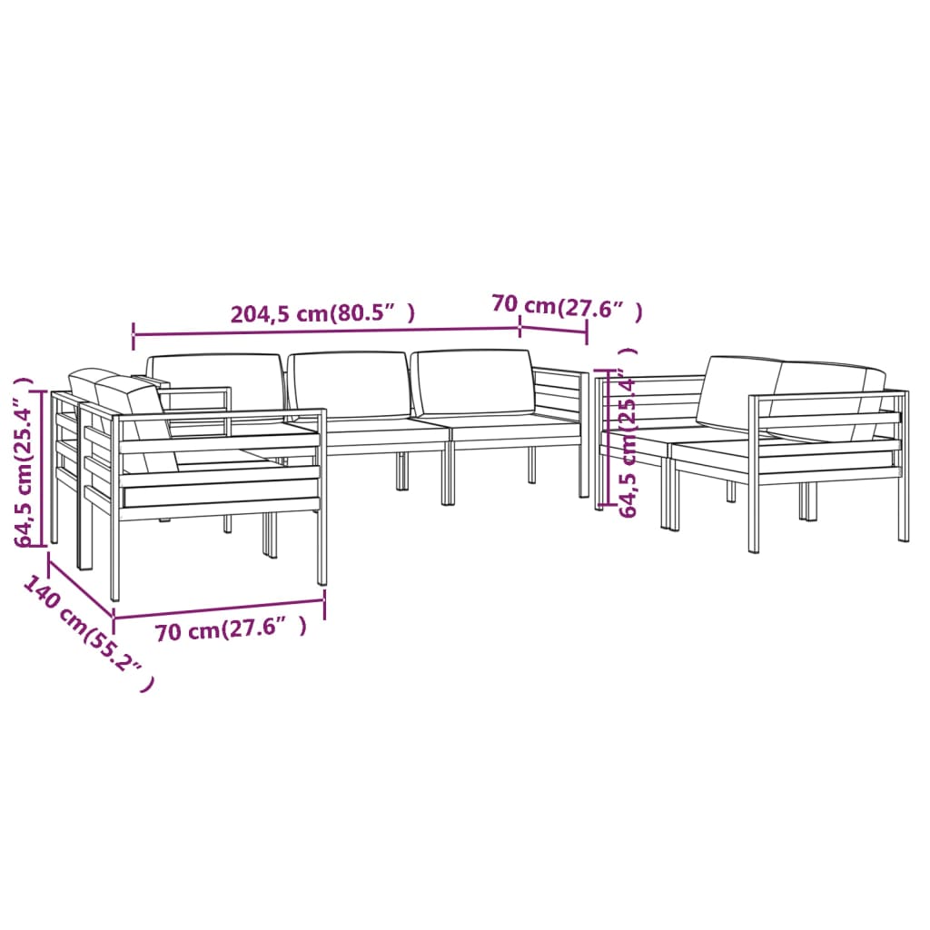 Combining both style and functionality, this aluminium garden lounge set provides a perfect place for you to relax and enjoy leisure time in the utmost comfort. Modular design: This patio lounge set features a modular design, which allows you to combine its modular sections in different configurations whichever you like!Premium material: Made from aluminium, the outdoor lounge set is weather-resistant and sturdy. The lightweight construction makes it easy to move around.Comfortable cushions and pillows: The seat cushions and back pillows are included for your comfort. Note:In order to extend the life of your outdoor furniture, we recommend you to clean it regularly and do not leave it outdoors without protection unnecessarily.Clean: Use a mild soap solution.Storing: If possible, store in a cool, dry place indoors. If the product is stored outdoors, protect it with a waterproof cover. Wipe and dry the excess water or snow from flat surfaces after a rain or snowfall. Allow sufficient air circulation to avoid moisture-related damage.