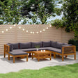 This wooden lounge set is a perfect combination of style and functionality. With this in your garden, you can spend relaxing and soothing time with your family and friends. Featuring a solid acacia wood frame, the sofa set is strong, sturdy and durable; and its oil finish makes the sofa set suitable for outdoor use. The removable cushions are thickly padded, so as to offer great seating comfort. A coffee table, featuring a unique slatted design, is also included. Additionally, standing out with its modular design, all parts can be arranged and customised as you need. This outdoor seating set will surely be the focal point of your garden or patio. Note: In order to extend the life of your outdoor furniture, we recommend you to clean it regularly and do not leave it outdoors without protection unnecessarily.Clean: Use a mild soap solutionStoring: If possible, store in a cool, dry place indoors. If the product is stored outdoors, protect it with a waterproof cover. Wipe and dry the excess water or snow from flat surfaces after a rain or snowfall. Allow sufficient air circulation to avoid moisture-related damage.
