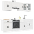 This 8-piece kitchen cabinet set, with its elegant design, optimises your kitchen space and provides ample storage space for your personal belongings! Stable and durable material: Engineered wood is a durable and stable material with a smooth surface that is resistant to moisture, warping, and splitting, making it a reliable choice for a variety of projects.Ample storage space: The kitchen cabinet set has many compartments, and offers sufficient space to store bowls, plates, pots, and other kitchen appliances.Adjustable feet: The bottom cabinets feature adjustable feet that can be adjusted in height to suit your kitchen layout.Easy to maintain: Thanks to its smooth surface, these kitchen cabinets are easy to clean with a damp cloth and require less maintenance. Warning:To prevent it from tipping over, this product must be used with the provided wall attachment device. Good to know:Screw(s) and plug(s) for inside the wall are not included. Seek and use screw(s) and plug(s) suitable for your walls. If you are uncertain, seek professional advice. Read and follow each step of the instruction carefully.The worktop, sink and faucet are not included in the delivery.