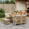 This garden dining set is a great choice for al fresco dining or just relaxing in the garden, backyard, or on the patio. Durable material: PE rattan, also known as poly rattan, is a strong, low-maintenance synthetic material that looks like natural rattan. It's lightweight, easy to clean, and commonly used for outdoor furniture due to its durability and weather-resistant properties.Compact storage: These chairs have a flap backrest that can be folded down, making it easy to store them under the table. When folded, they neatly fit under the table, forming a space-saving cube shape. Additionally, the stools can also be stored under the chairs, further maximizing space efficiency.Comfortable seat experience: This outdoor furniture, complete with thickly padded cushions, offers a comfortable seating experience.Removable and washable cover: These cushions feature removable covers for easy washing and maintenance. The cushion covers have a flap at the back for easy attachment to the backrests.Stable and easy-to-clean tabletop: This garden table has an acacia wood top that is sturdy, durable, and easy to clean with a damp cloth. Good to know: To make sure your outdoor furniture stays beautiful, we recommend protecting it with a waterproof cover.