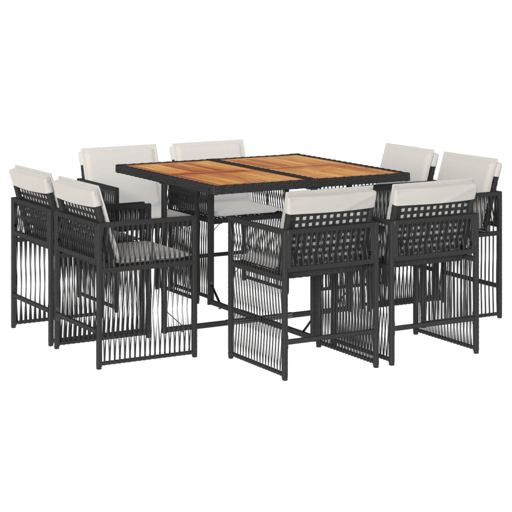 This garden dining set is a great choice for al fresco dining or just relaxing in the garden, backyard, or patio. Durable material: PE rattan, also known as poly rattan, is a strong, low-maintenance synthetic material that looks like natural rattan. It's lightweight, easy to clean, and commonly used for outdoor furniture due to its durability and weather-resistant properties.Compact storage: These chairs have a flap backrest that can be folded down, making it easy to store them under the table. When folded, they neatly fit under the table, forming a space-saving cube shape.Comfortable seat experience: This outdoor furniture, complete with thickly padded cushions, offers a comfortable seating experience.Removable and washable cover: These seat cushions feature removable covers for easy washing and maintenance. The cushion covers have a flap at the back for easy attachment to the backrests.Stable and easy-to-clean tabletop: This garden table has an acacia wood top that is sturdy, durable, and easy to clean with a damp cloth. Good to know:To make sure your outdoor furniture stays beautiful, we recommend protecting it with a waterproof cover.